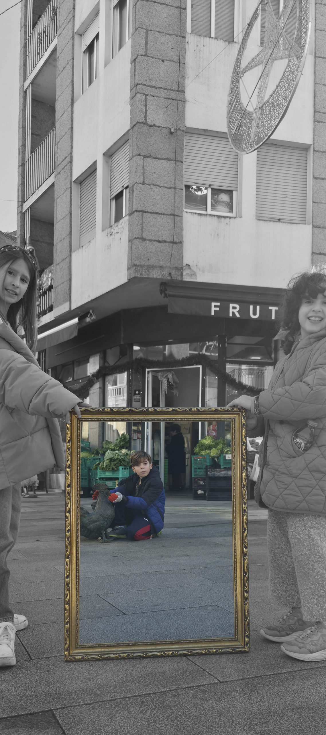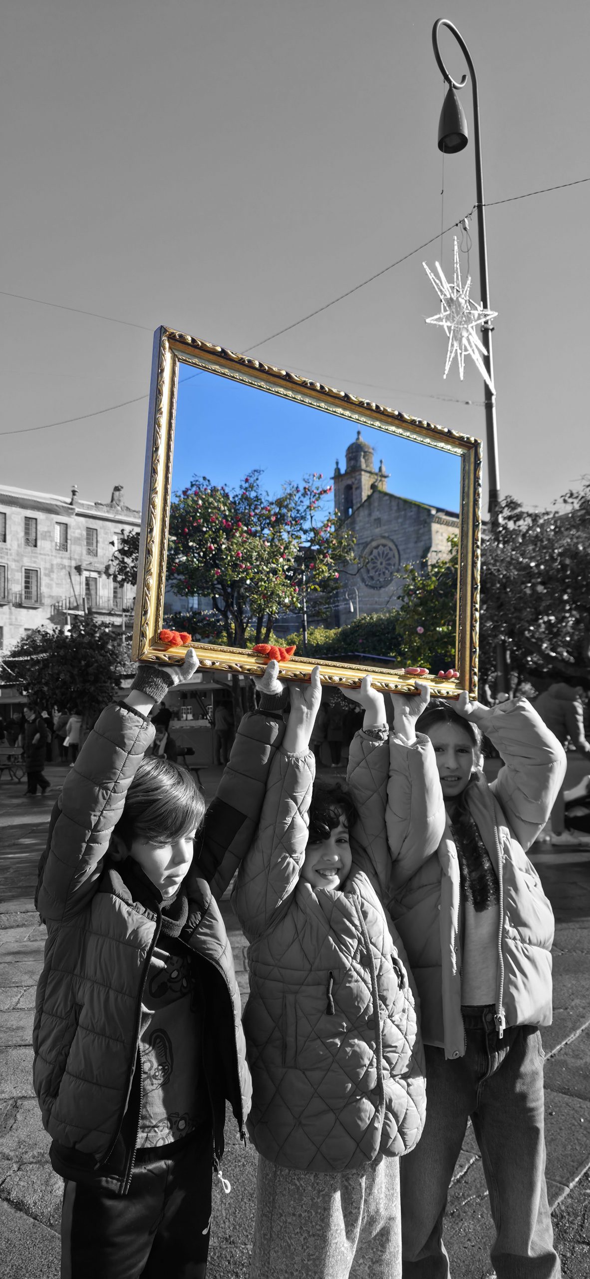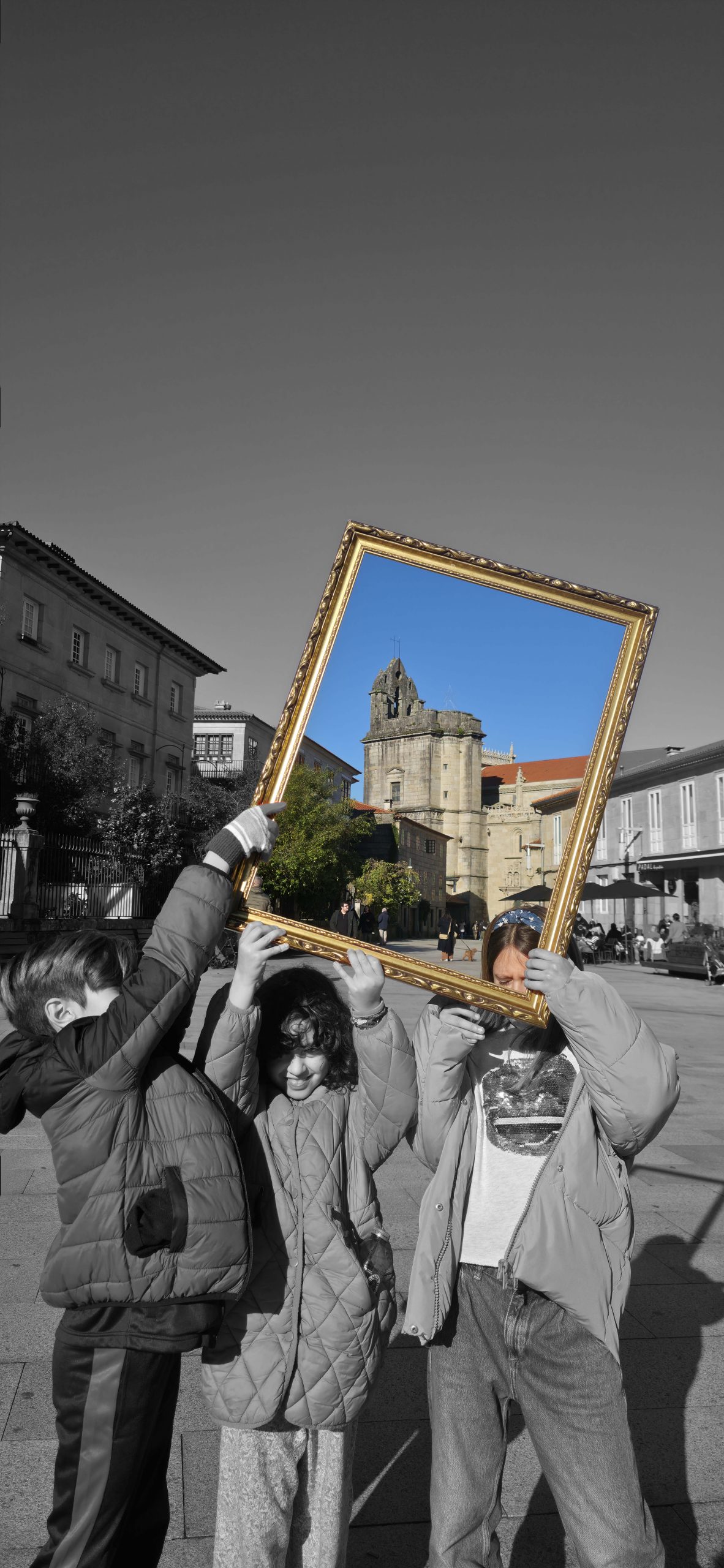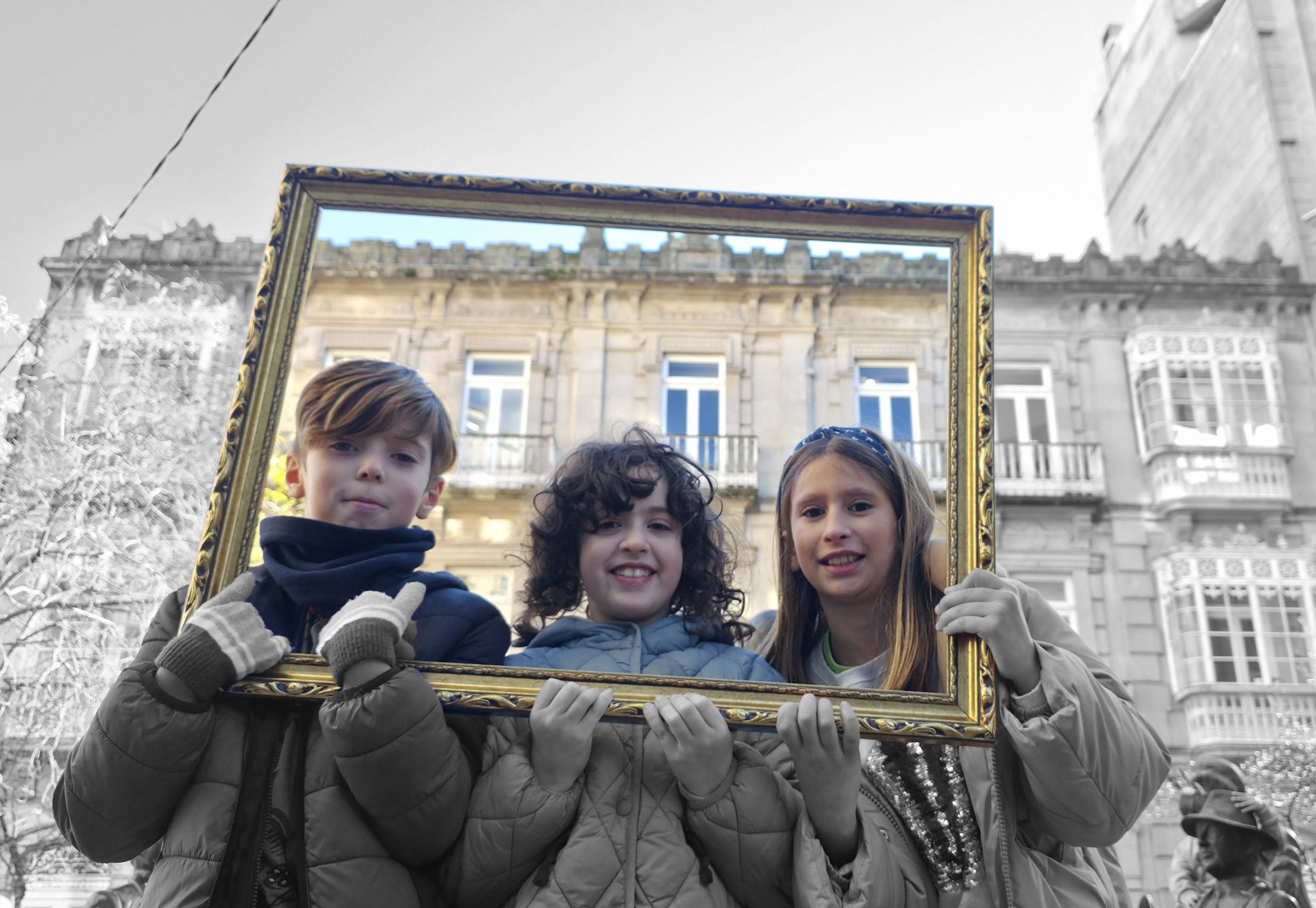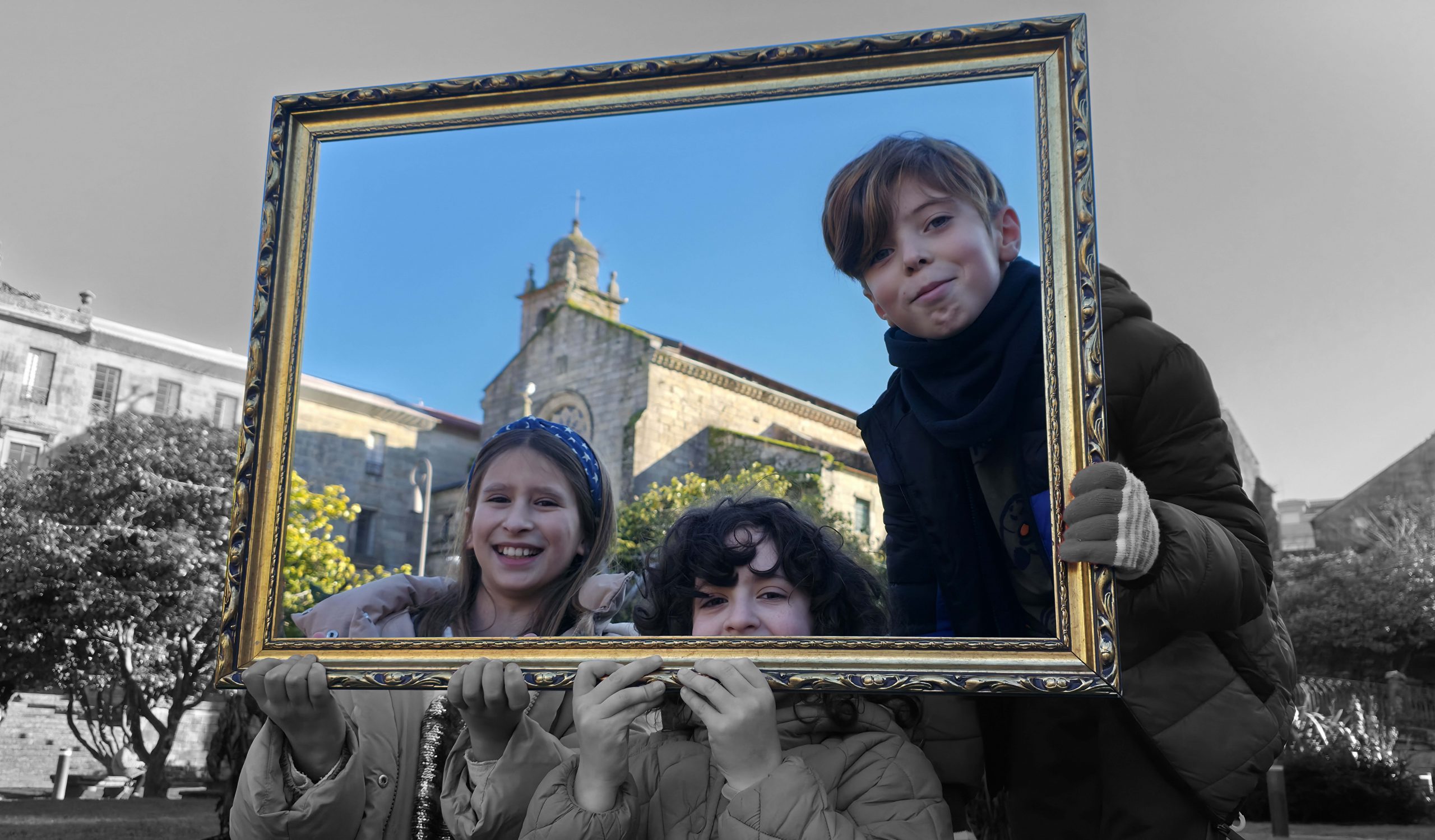 To understand how the inhabitants, both current and future, perceive their village, we will use the following strategy: we set off ‘adrift’ with a large golden frame, so that during our wandering, we frame those urban elements that are important to them (an experience based on the work of O’Grady). Who have been the protagonists of this ‘A Vila do Mañá’ experience? On this occasion, during their wandering, they have reDISCOVERED places in their village, perhaps forgotten ones.